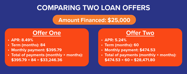 Despite a lower monthly payment, offer one costs more because the APR is higher and the loan term is longer. Offer two has a higher monthly payment, but costs less overall because the APR is lower, and the term length is shorter.