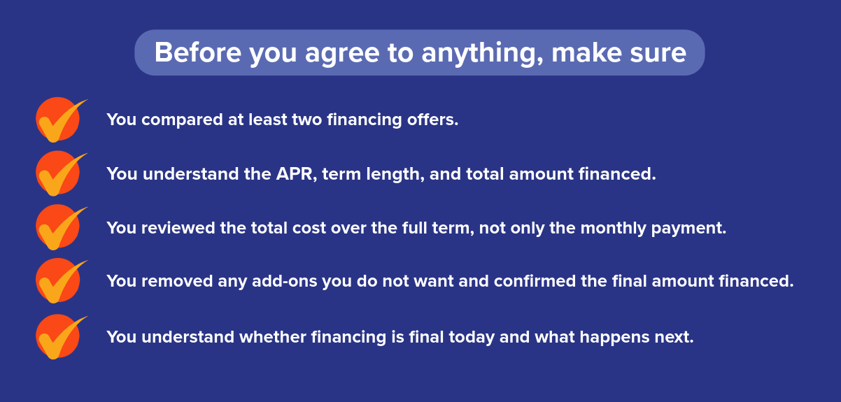 Ask for a full breakdown of price and financing terms. Review the documents before you sign. Consumer.gov warns that some dealers try to change the cost of financing or add charges you did not expect. [8]